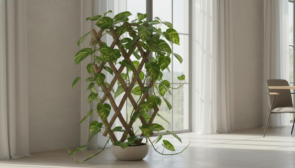 Эпипремнум золотистый вьется по деревянной решетке в ярко освещенной комнате у окна.