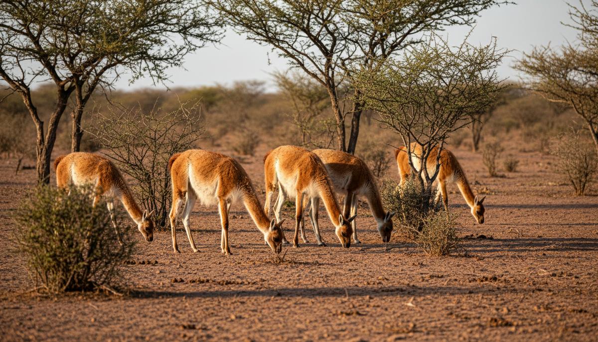Стадо гуанако пасётся среди редких деревьев и кустарников в сухом лесу Чако, пыльная земля под теплым светом.