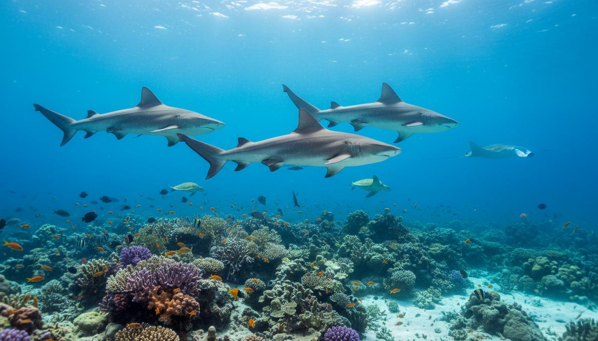 Группа тупорылых акул плывет в прозрачной толще океанской воды над коралловым рифом