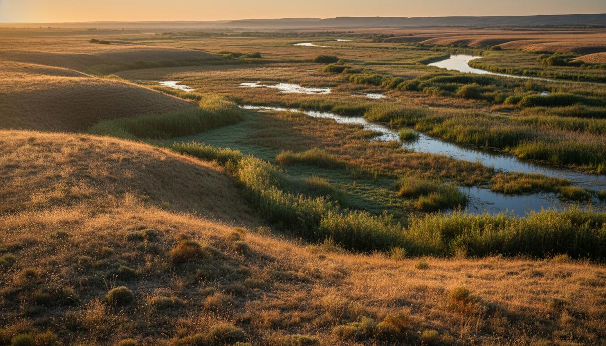 Панорама испанской степи и водно-болотных угодий в лучах утреннего солнца.