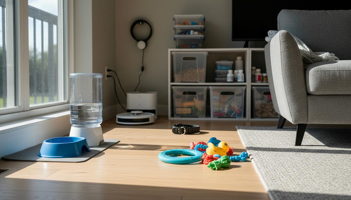 Домашний интерьер с солнечным светом, где расставлены различные пластиковые предметы: миски для животных, электроника, контейнеры для хранения. Общий вид бытовой обстановки.