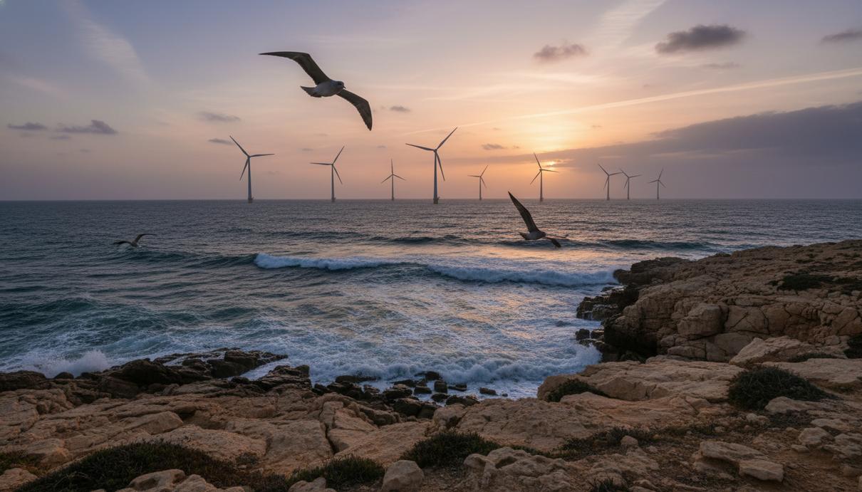 Морской пейзаж с летящей птицей на фоне отдаленных ветряных генераторов в Средиземном море.