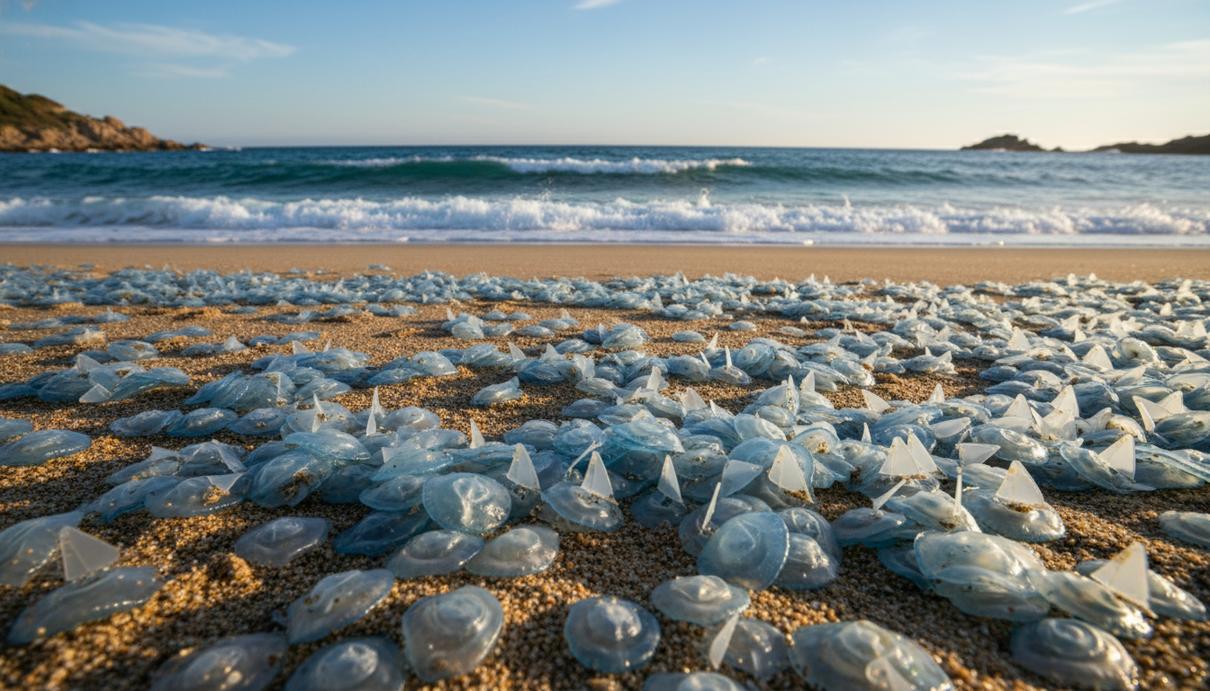 Побережье Сан-Марти-д’Эмпуриес в испанском муниципалитете Л’Эскала оказалось покрыто слоем мелких морских организмов ярко-синего цвета. Массовое появление гидроидов, известных как «парусники» или велеллы, вызвано сезонными восточными ветрами, которые местные жители традиционно называют «штормом бобов». Подобные явления обычно сигнализируют о начале климатической весны на побережье Коста-Брава.
