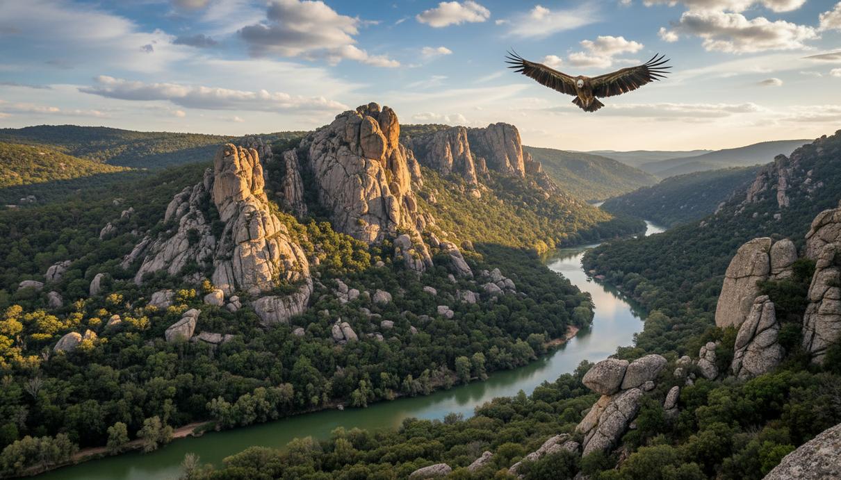 Горный ландшафт парка Монфраге, Эстремадура. Над скалистыми утесами и лесами парит крупная хищная птица, виднеется река.