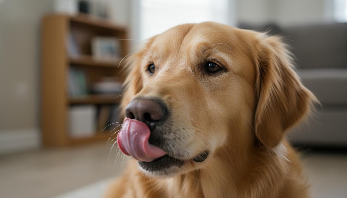 Собака крупным планом облизывает нос и отводит взгляд в сторону в интерьере комнаты