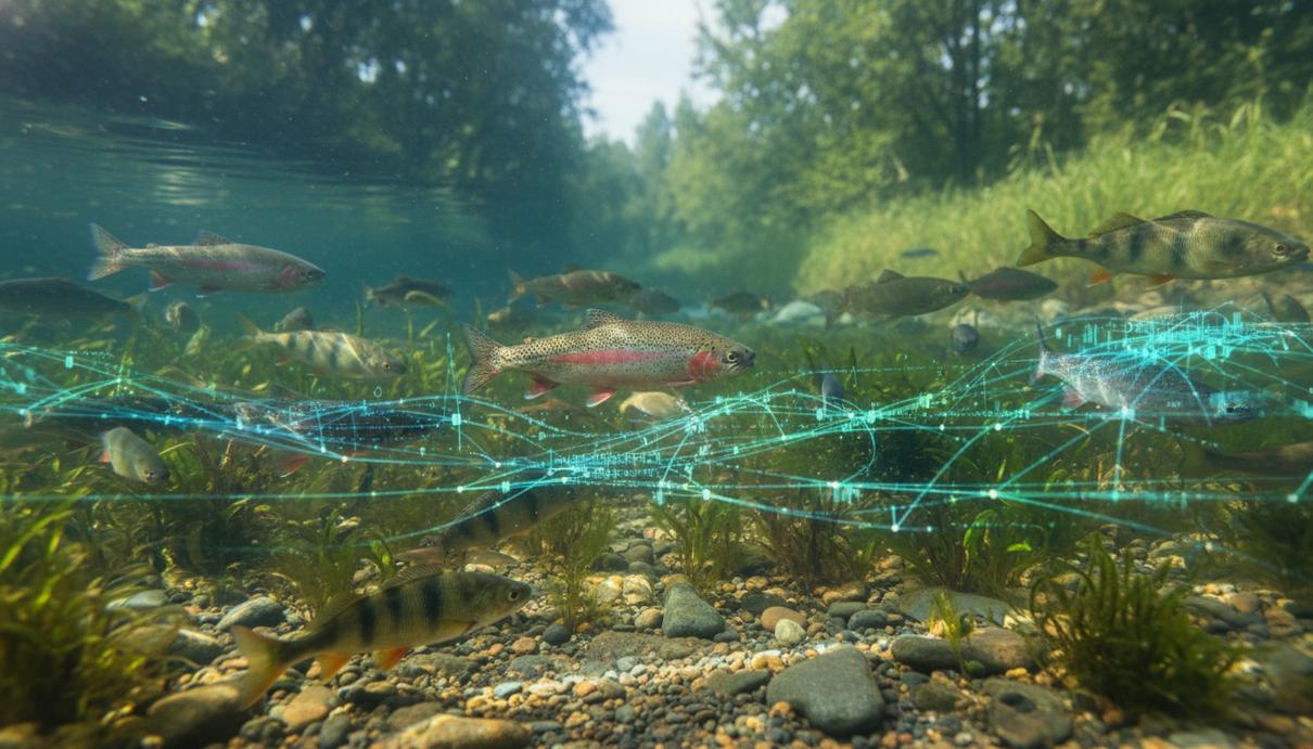 Подводная сцена: чистая пресноводная река, кишащая рыбами, с элементами цифрового мониторинга ИИ для сохранения видов.