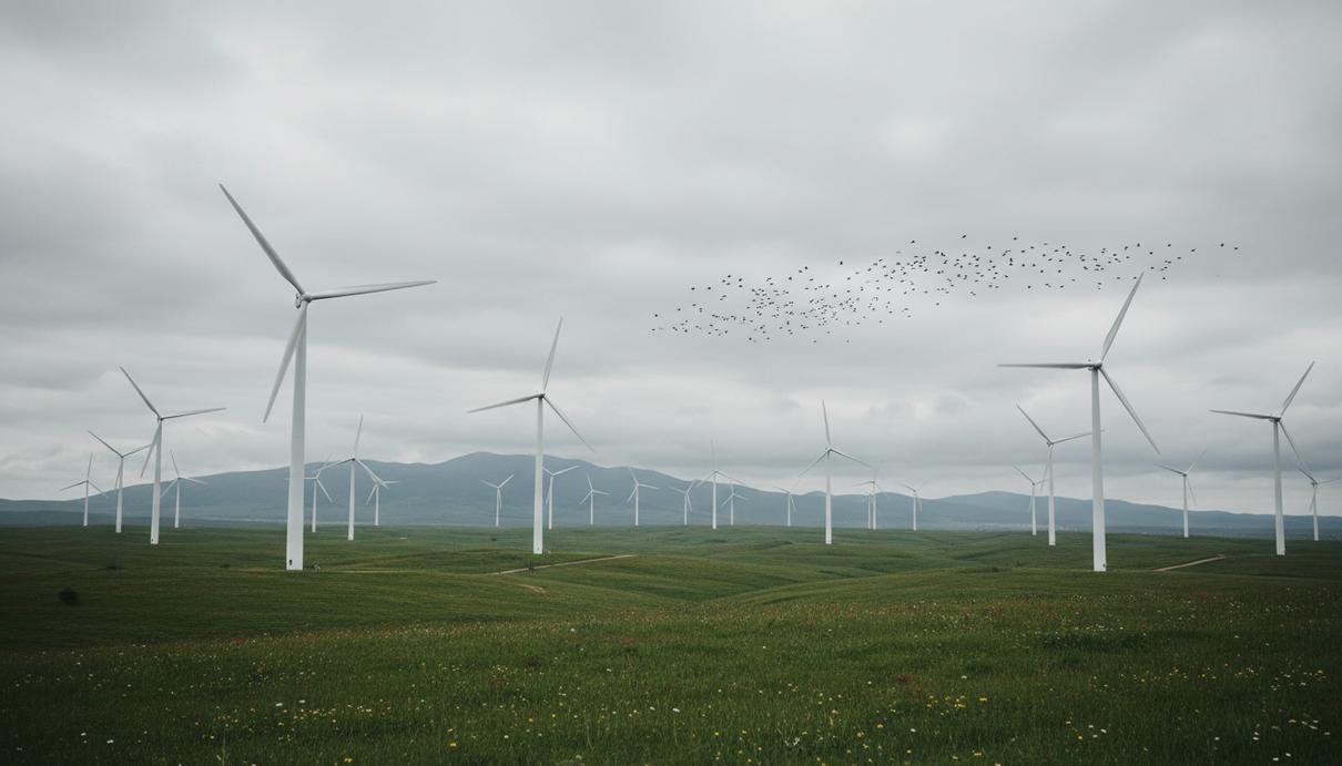 Ряд белых ветряных турбин в зеленом поле под пасмурным небом и стая птиц в отдалении