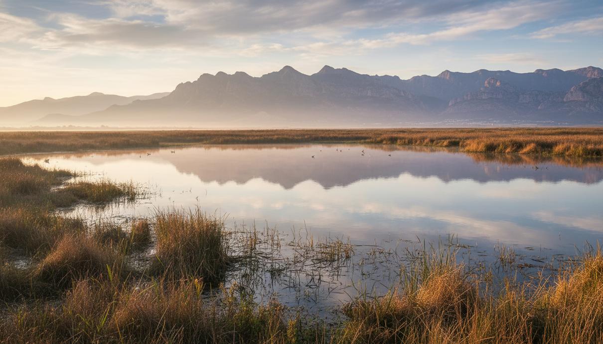 Панорама восстановленного водно-болотного угодья в Испании с водными растениями и холмами на горизонте.