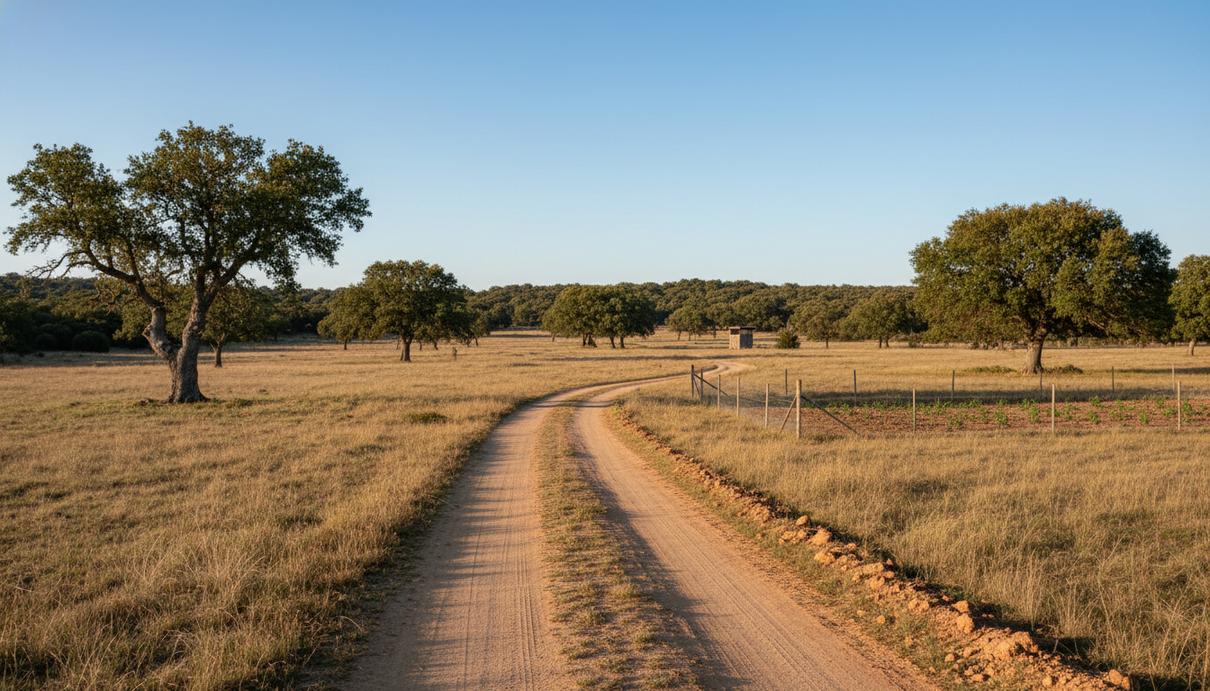 Обширный ландшафт дехесы национального парка Кабаньерос, Испания, с вековыми дубами и редким кустарником. Пыльная грунтовая дорога извивается по саванноподобной местности, простирающейся до горизонта.