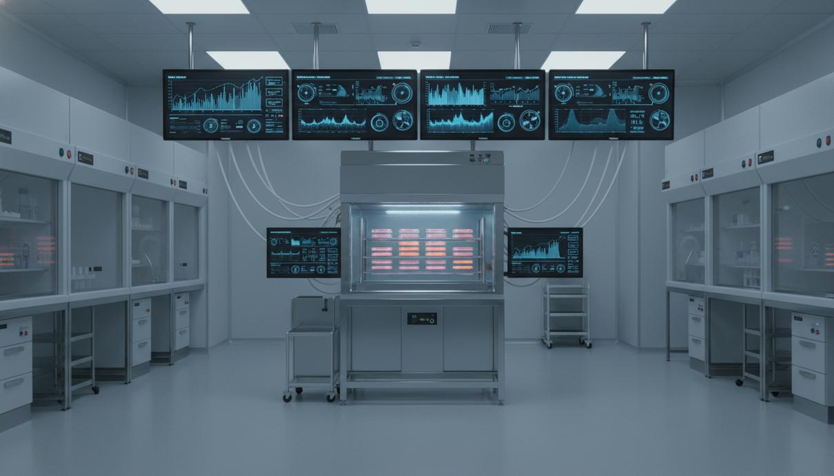 Интерьер стерильной лаборатории с инкубатором для клеточных культур и цифровыми экранами.