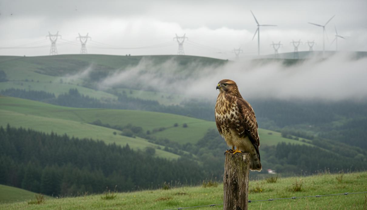 Обыкновенный канюк на деревянном столбе на фоне горного тумана и линий электропередачи в Астурии.