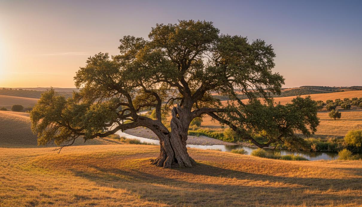 Огромный вековой дуб с раскидистой кроной на фоне холмов и реки в Андалусии