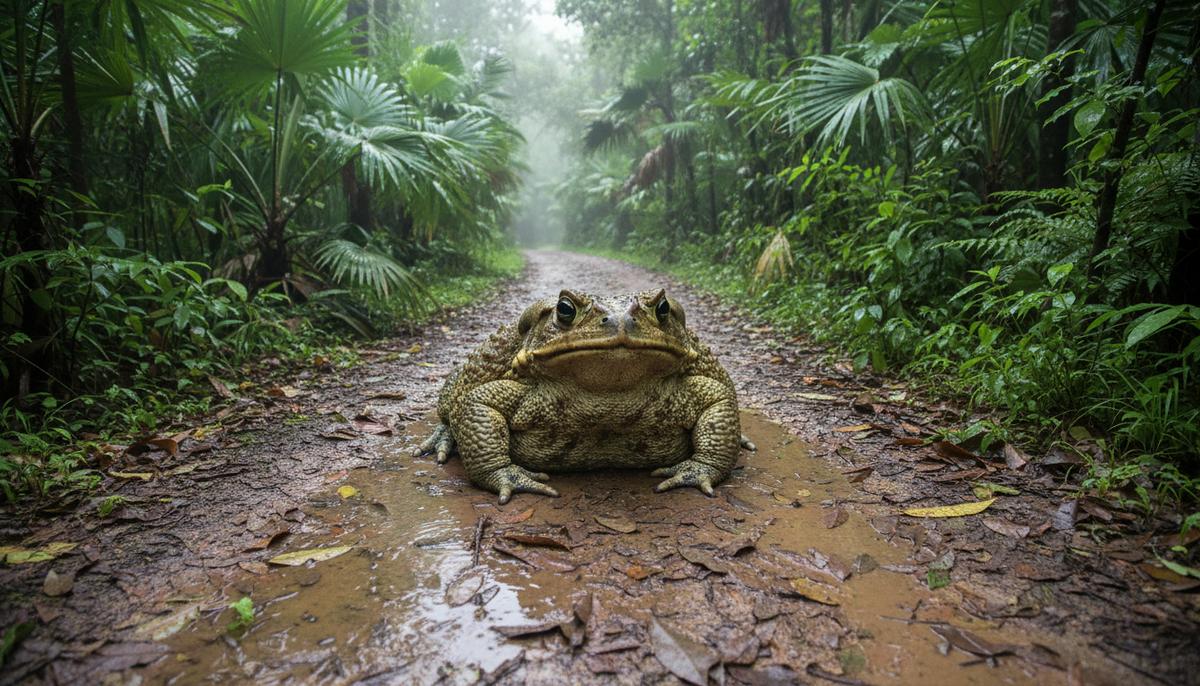 Огромная тростниковая жаба на влажной лесной тропе в Национальном парке Австралии, среди пышной зелени.