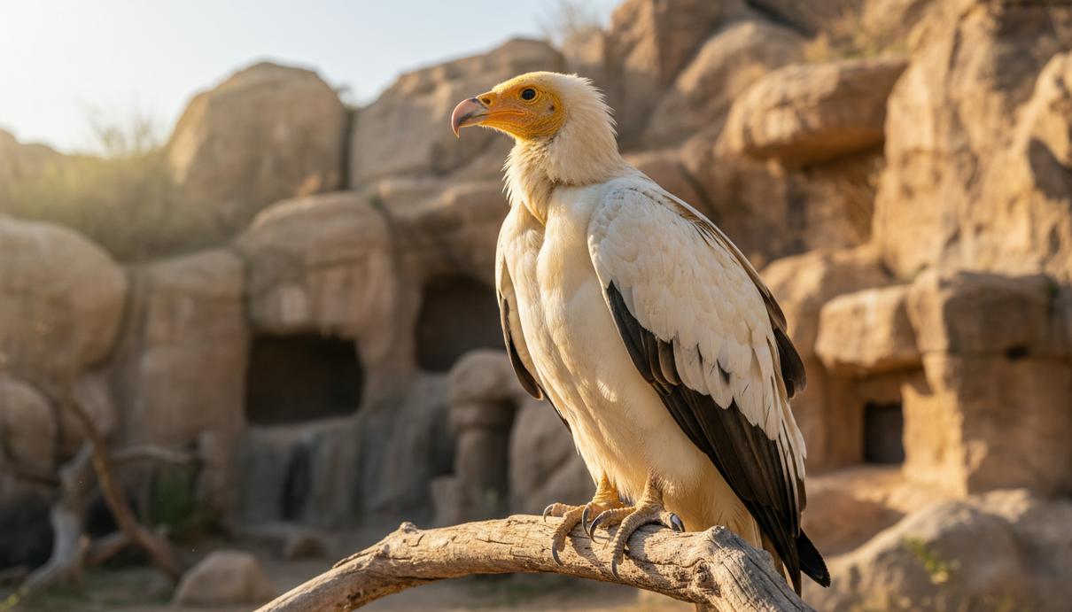 Обыкновенный стервятник сидит на деревянной перекладине в просторном вольере центра реабилитации птиц