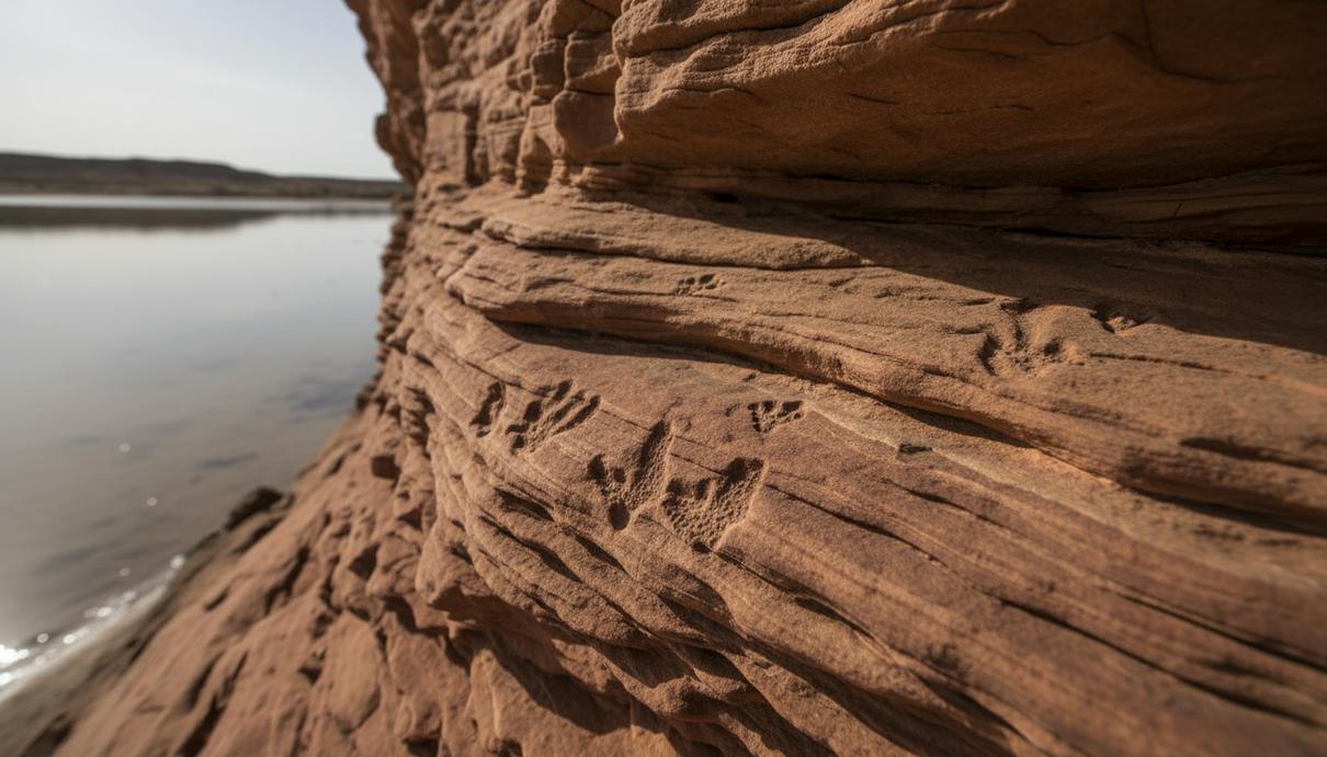 Следовая дорожка T1 состоит из семи отпечатков – четырех лап и трех стоп – и соответствует ящерице длиной около 50 сантиметров. T2, с шестью отпечатками, принадлежит более мелкому экземпляру, примерно 30 сантиметров. Однако самая поразительная деталь кроется не в размере. На T1 видна непрерывная, широкая и прямая структура с небольшим рельефом – несомненный след хвоста. Кроме того, нерегулярное расстояние между лапами и стопами указывает на необычный способ передвижения.