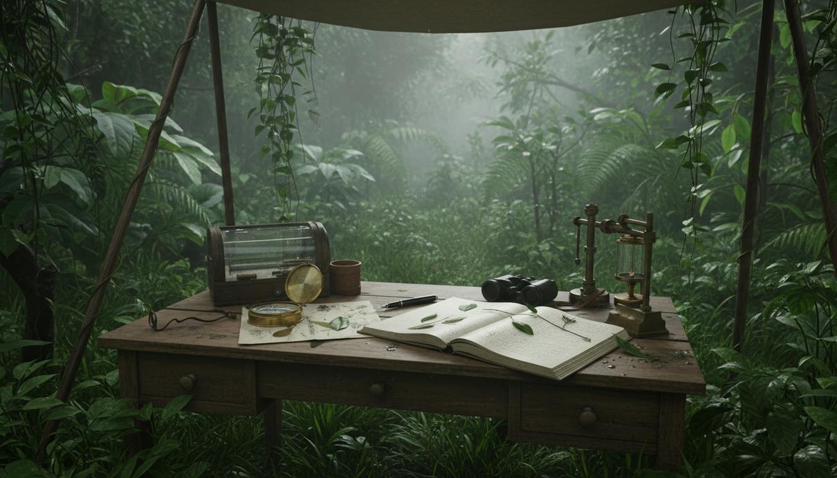 Деревянный стол с биноклем и блокнотом для записей на фоне густых зеленых зарослей тропического леса.
