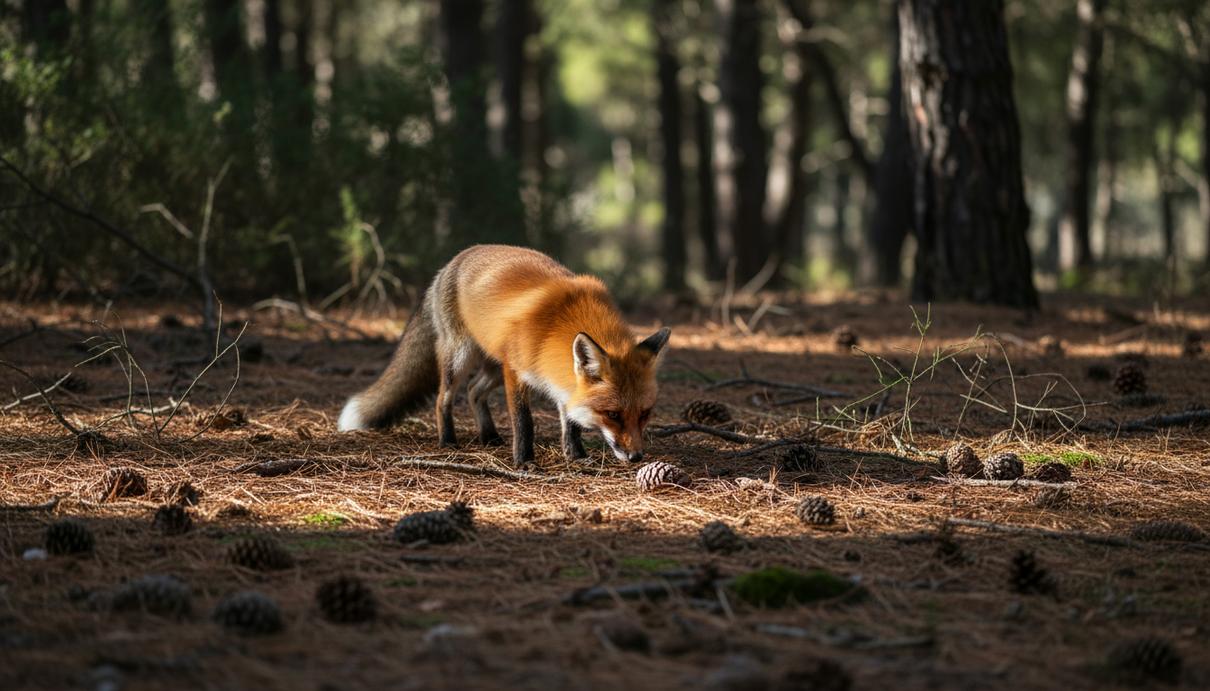 Рыжая лисица обнюхивает землю в хвойном лесу среди иголок и сосновых шишек