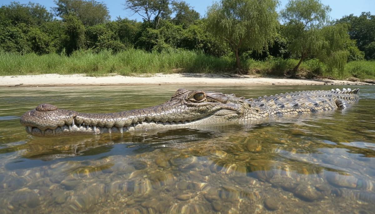 Гангский гавиал в естественной среде обитания: река с песчаными отмелями и прибрежной растительностью. Водное животное с длинной узкой мордой.