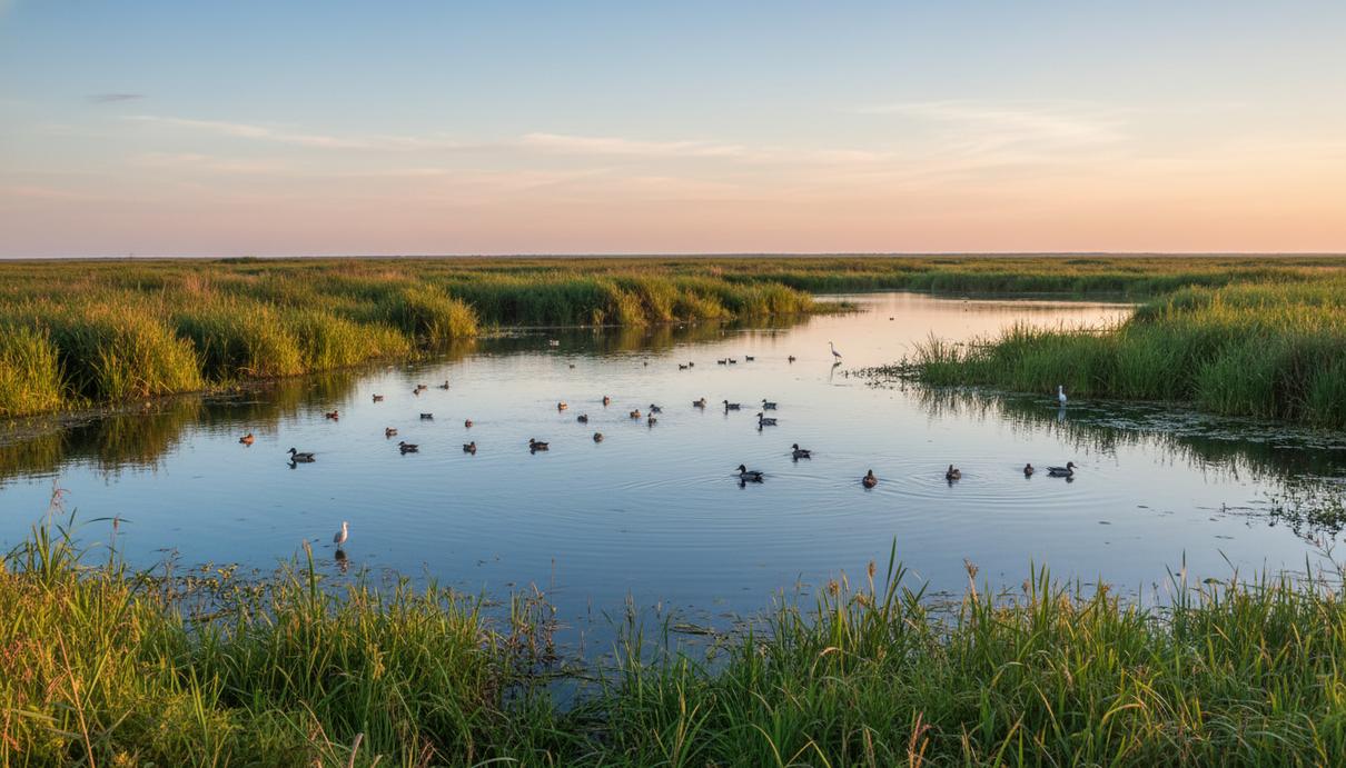 Водно-болотные угодья с густыми зарослями камыша и группами водоплавающих птиц на водной глади