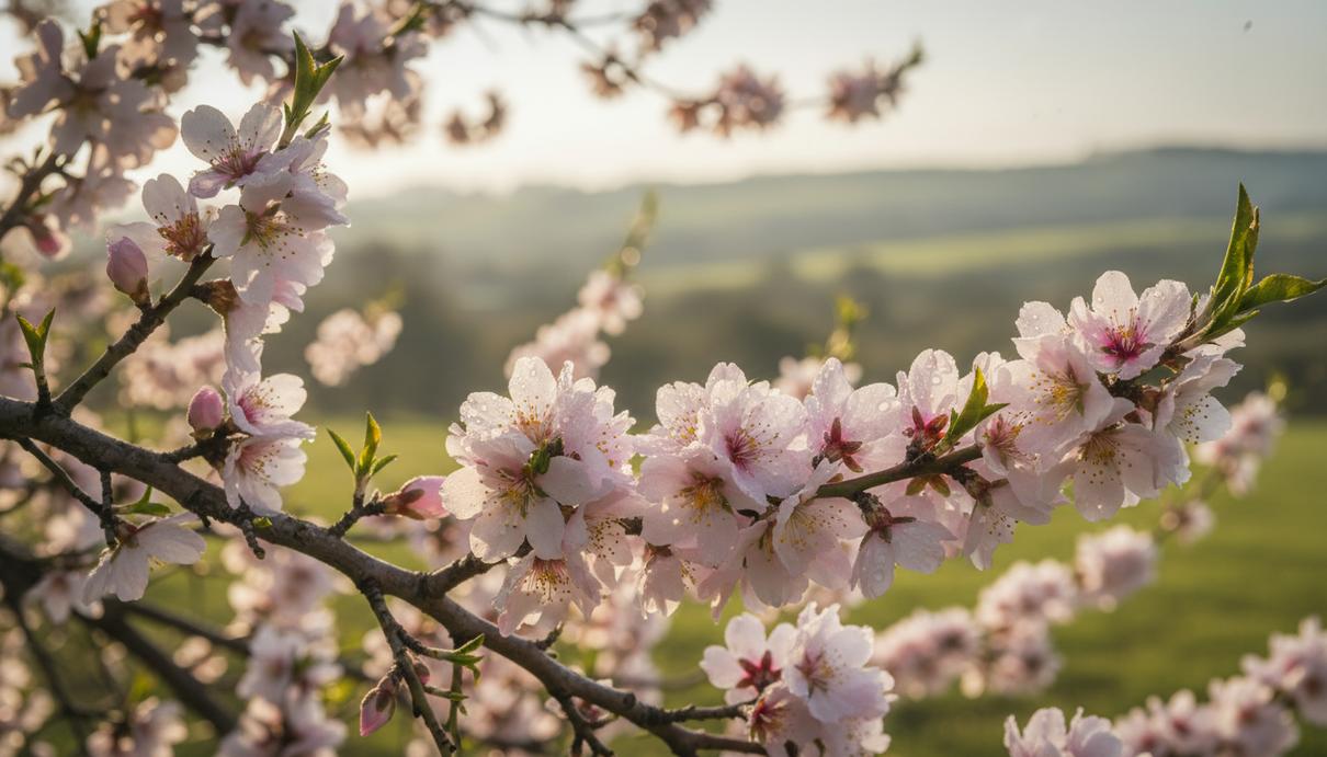 Ветка миндаля с нежно-розовыми цветами и каплями росы в лучах утреннего солнца